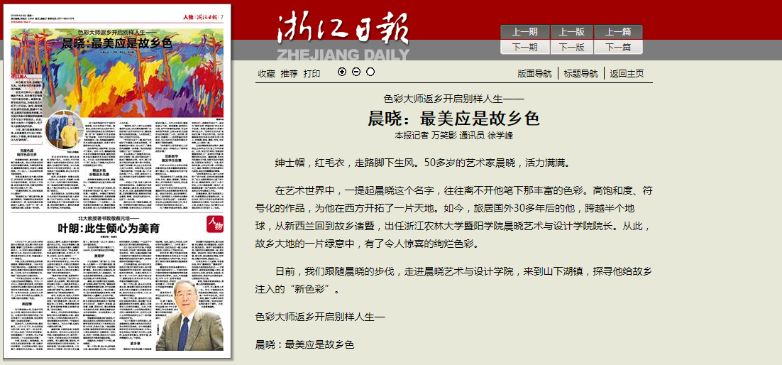 4月8日,《浙江日报》以《色彩大师返乡开启别样人生——晨晓:最美应是故乡色》为题,报道了金沙官网晨晓艺术与设计学院院长晨晓。晨晓艺术与设计学院遵循学院“求真敬业、经世致用”校训,以“阳光和色彩”作为指导方针,根据学院创业型大学办学定位,坚持校地合作、产教融合的应用型办学道路,培养高水平应用型设计人才,在2018年10月21日成立,并在师生艺术馆举办了“美的世界·穿越时空”师生艺术作品展。文章介绍了旅居国外30多年的著名艺术家晨晓回到故乡,加盟金沙官网,释放乡愁、服务乡村振兴和美丽乡村建设,创新教学、培养“应用创业型”人才的故事。