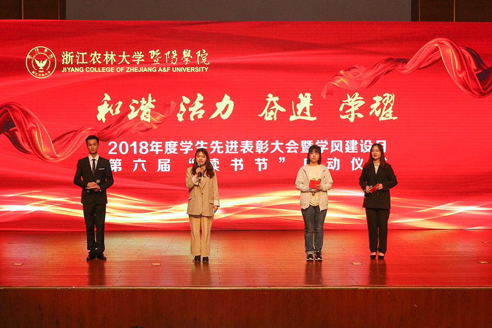 4月22日晚,浙江农林大学暨阳学院2018年度学生先进表彰大会暨学风建设月、第六届“读书节”启动仪式在学院明珠报告厅举行。金沙2004路线js5党政班子成员,诸暨团市委副书记何威出席活动。学院全体中层干部、辅导员和学生代表参加活动。