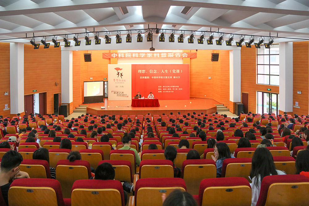 5月10日下午,金沙官网在明珠报告厅举行暨阳红论坛第二十讲,邀请中国科学院文联主席郭曰方教授作题为“理想、信念、人生”(党课)的专题报告。全体党员及入党积极分子、师生代表500余人聆听了报告。报告会由副院长袁志刚主持。