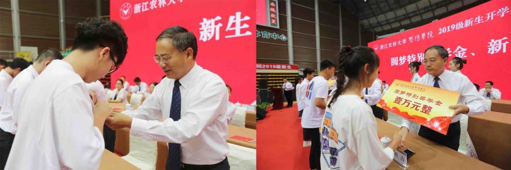 胡祖吉与在主席台前排就座的领导为新生佩戴了院徽并为获得圆梦特别奖学金、新生奖学金的同学颁发了荣誉证书。