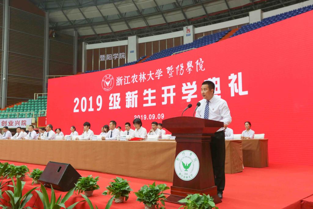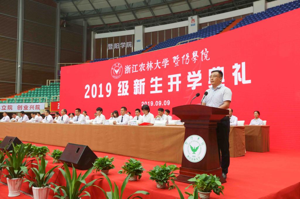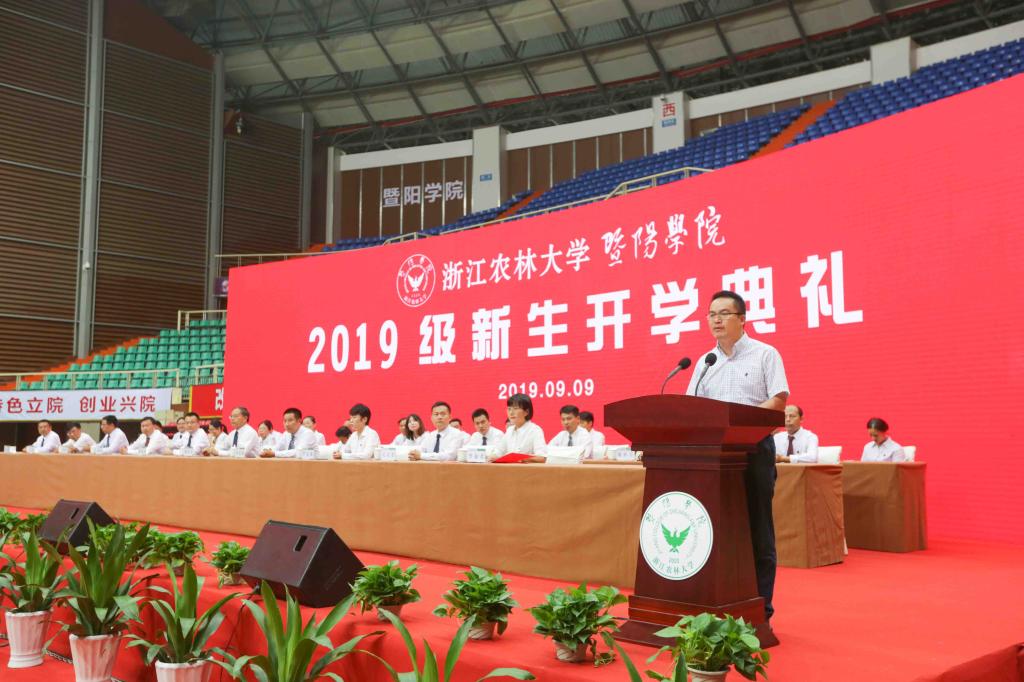 院长徐爱俊教授代表学院对全体新生表示热烈欢迎,并向辛勤培育的父母和老师们致以崇高的敬意。他以“奋进暨阳人 追梦新时代”为题,介绍了浙江农林大学概况,深情回顾了学院20年的办学历程,以生动详实的事迹和经典爱国主题影视剧作品中的对白激励新生成长为奋进追梦的暨阳人。