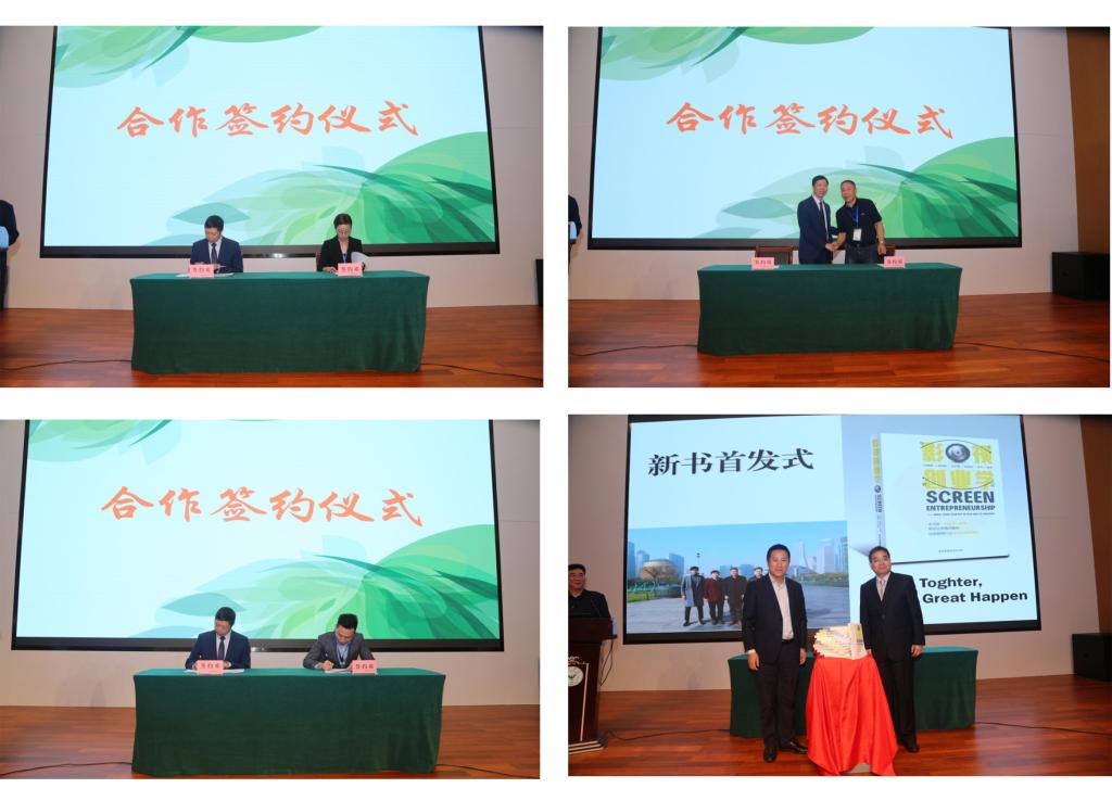 揭牌仪式上,学院还与大壹供应链有限公司、浙江省珍珠行业协会、诸暨夜猫子网络科技有限公司举行签约仪式,就课程开发、主播训练营培训、学生实习实训等方面开展进一步的深入合作,并举行了乡村振兴研究院第一本教材——《影视创业学》的首发仪式。