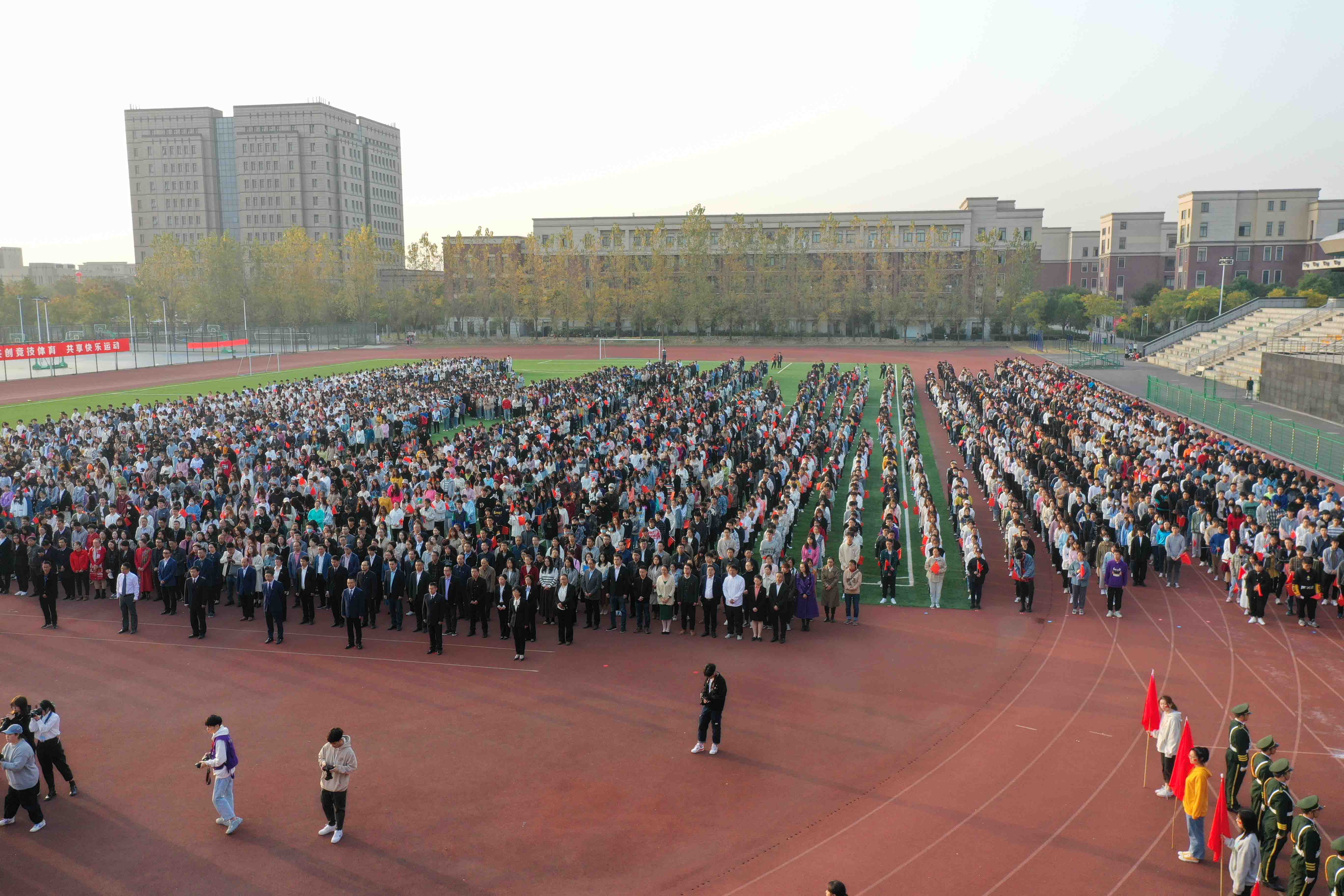 伴着院庆日的朝阳升起,金沙2004路线js5办学20周年院庆日升国旗仪式在田径场隆重举行。学院党政班子成员,全体中层干部,校友代表,全体师生参加仪式。升国旗仪式由学院党委副书记高国俊主持。