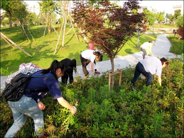 当天下午5:30,参加除草活动的同学们分成6个作业小组,来到各自的任务区域开始各自的工作。没有开始的口号,只有无声的行动;没有路人的赞赏,只有内心满溢的幸福。在现场,同学们积极劳动,人人争先,个个向前,发扬不怕苦、不怕脏、不怕累的精神。男生主动承担起脏活、累活、重活,女生们也不甘示弱,纷纷弯腰下蹲,开始了紧张辛苦的杂草清除。整场活动分工协作,有条不紊,处处呈现出一派热火朝天的劳动景象。尽管泥土弄脏了衣服和鞋子,蚊虫叮咬着大家的身体,汗水浸湿了衣背,但近400名“90后”同学全然不顾,专心致力于杂草清除工作,整个活动持续近1个半小时,直到华灯初上才纷纷离开作业区域。