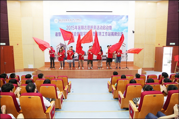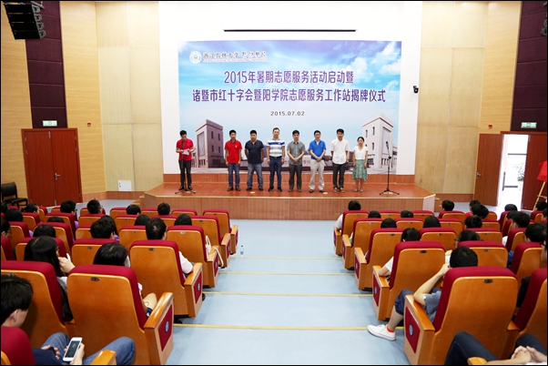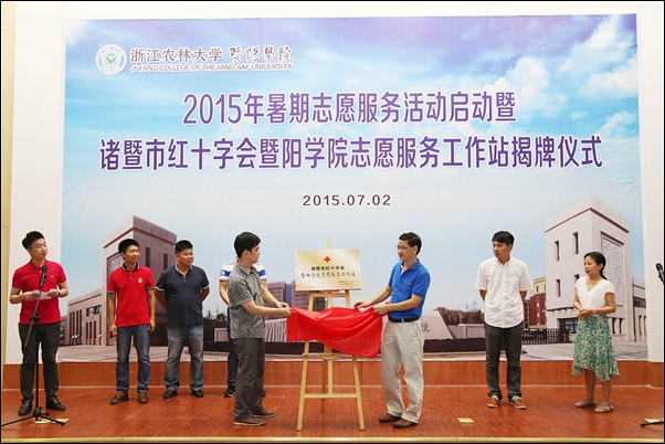 仪式上,办公室负责人和诸暨市红十字会执委会副主任共同为诸暨市红十字会金沙2004路线js5“志愿服务工作站”揭牌;学工部、团委相关负责人宣读了2015年暑期社会实践立项团队名单,并作了安全培训。