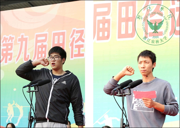 工程技术系张浩同学和体军部李斌老师分别代表运动员和裁判员宣誓。