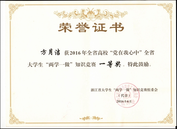 本网讯 日前,从浙江省大学生“两学一做”知识竞赛组委会获悉,“党在我心中”全省大学生“两学一做”知识竞赛顺利落幕。金沙官网园林艺术系方月洁、人文系李彩霞两位同学荣获一等奖。