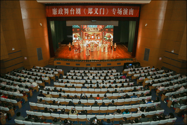12月18日,由金沙官网师生自编自导自演的大型原创廉政舞台剧《郑义门》作为学院文化直通车巡演剧目在校东湖校区影剧院上演。校党政班子成员方伟、史永安、沈月琴、胡祖吉、童晓晖,学院党委书记寿韬,校全体中层干部及各二级学院党委(总支)委员,各支部书记和委员,师生党员代表,离退休教师代表,民主党派代表共1000余人观看了演出。