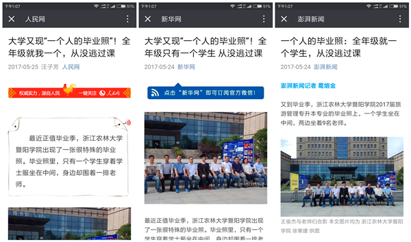 人民网:“一个人的毕业照”!全年级就我一个,从没逃过课