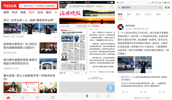 《钱江晚报》头条:一个人的大学,一个人的毕业照