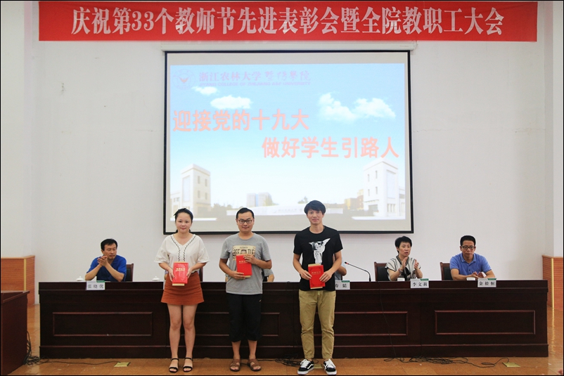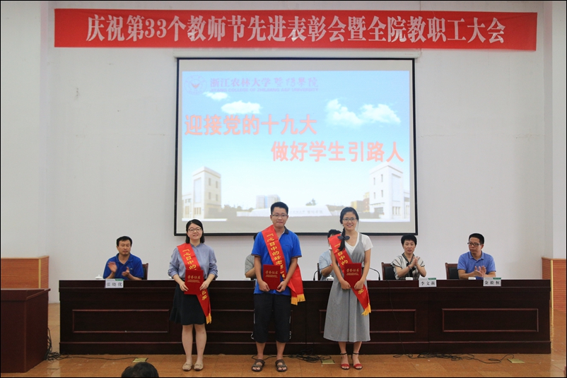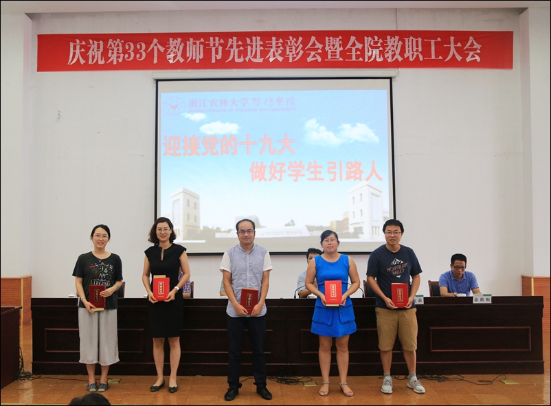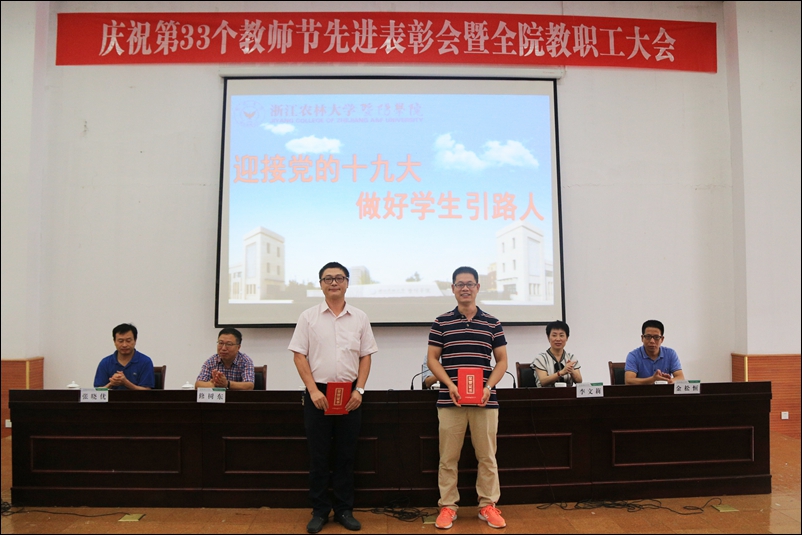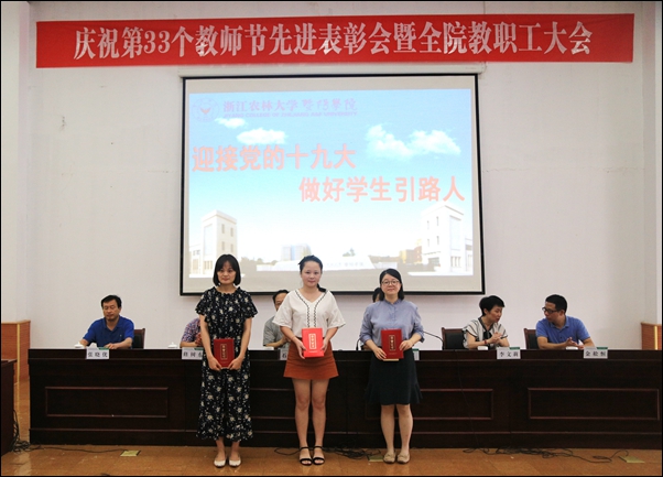 副院长金松恒宣读了从事教育工作满三十周年的教职工、学院第二届“我心目中的好老师”表彰文件、学院第十届青年教师教学技能比赛获奖名单、绍兴市2016学年高校优秀辅导员等表彰文件。与会领导为受表彰教师颁发荣誉证书。