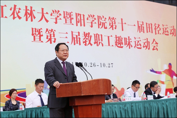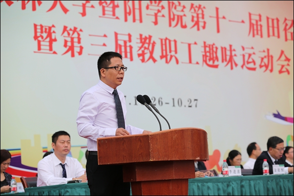 院长石道金宣布学院第十一届田径运动会暨第三届教职工趣味运动会开幕。