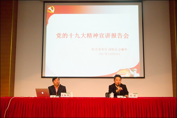 本网讯 12月15日下午,校党委委员、副校长金佩华到学院作题为《领悟新思想、拥抱新时代,开启学校发展新征程》的专题报告,从“十九大的重要成果”“十九大报告主要精神”“党章修正案重要内容”“拥抱新时代抢抓新机遇”“担当新使命 开启新征程”等五个方面宣讲党的十九大精神。报告会由院党委书记寿韬主持。