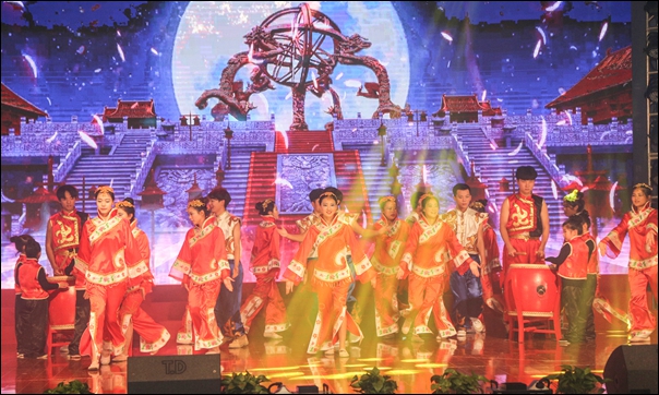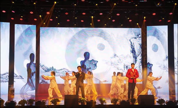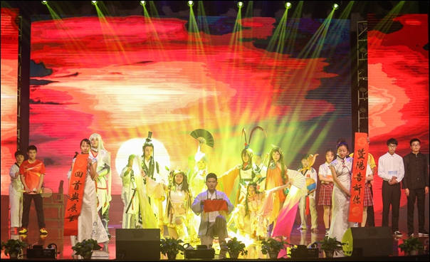 在开场曲目《盛世欢歌》锣鼓喧天、欢声雷动中,晚会正式拉开序幕。相声《同学会》、歌曲组合《校园聆听》一个用幽默风趣的语言讲述了同学们在暨阳的相遇、相识、相知和相惜,一个用不同歌曲串联演绎了精彩的暨阳生活;多个社团组合演绎《暨阳随想》,舞台上下喜跃抃舞,充分展现了学生社团的张扬个性;一曲《精忠报国》歌声气势磅礴,太极行云流水,一首《千年之约》古丝绸之路绵亘万里,延续千年,一场《Just for future》动感十足,炫出最酷学生风采。
