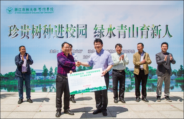 上午11时,以“珍贵树种进校园 绿水青山育新人”为主题、“珍贵树种进校园活动”暨学院珍贵树种植物园建设正式启动。石道金代表学院接受胡侠副厅长向学院赠送的“珍贵树进校园”赠苗清单。此次省林业厅共赠送第一批树苗:红豆杉、红豆树、浙江樟、浙江楠、花榈木、金钱松、福建山樱花、榉树、娜塔栎、舟山新木姜子、银杏等11个珍贵树种1200株树苗。