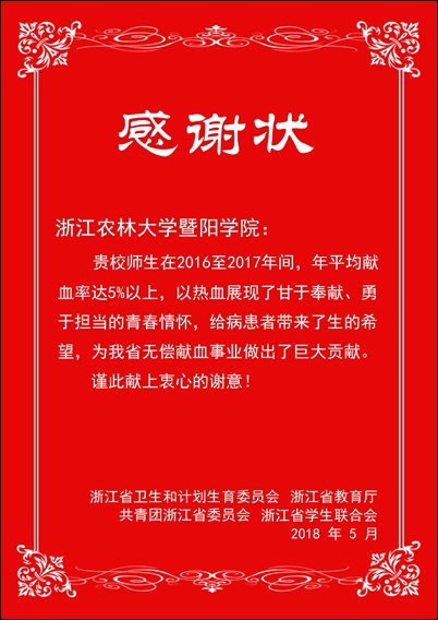 日前,从浙江省高校无偿献血工作总结会上获悉,金沙官网被评为2016-2017年度浙江省高校无偿献血爱心集体。林爱广老师获2016-2017年度省高校无偿献血组织发动先进个人,宣王威老师入选省首批无偿献血宣传教育高校讲师团。