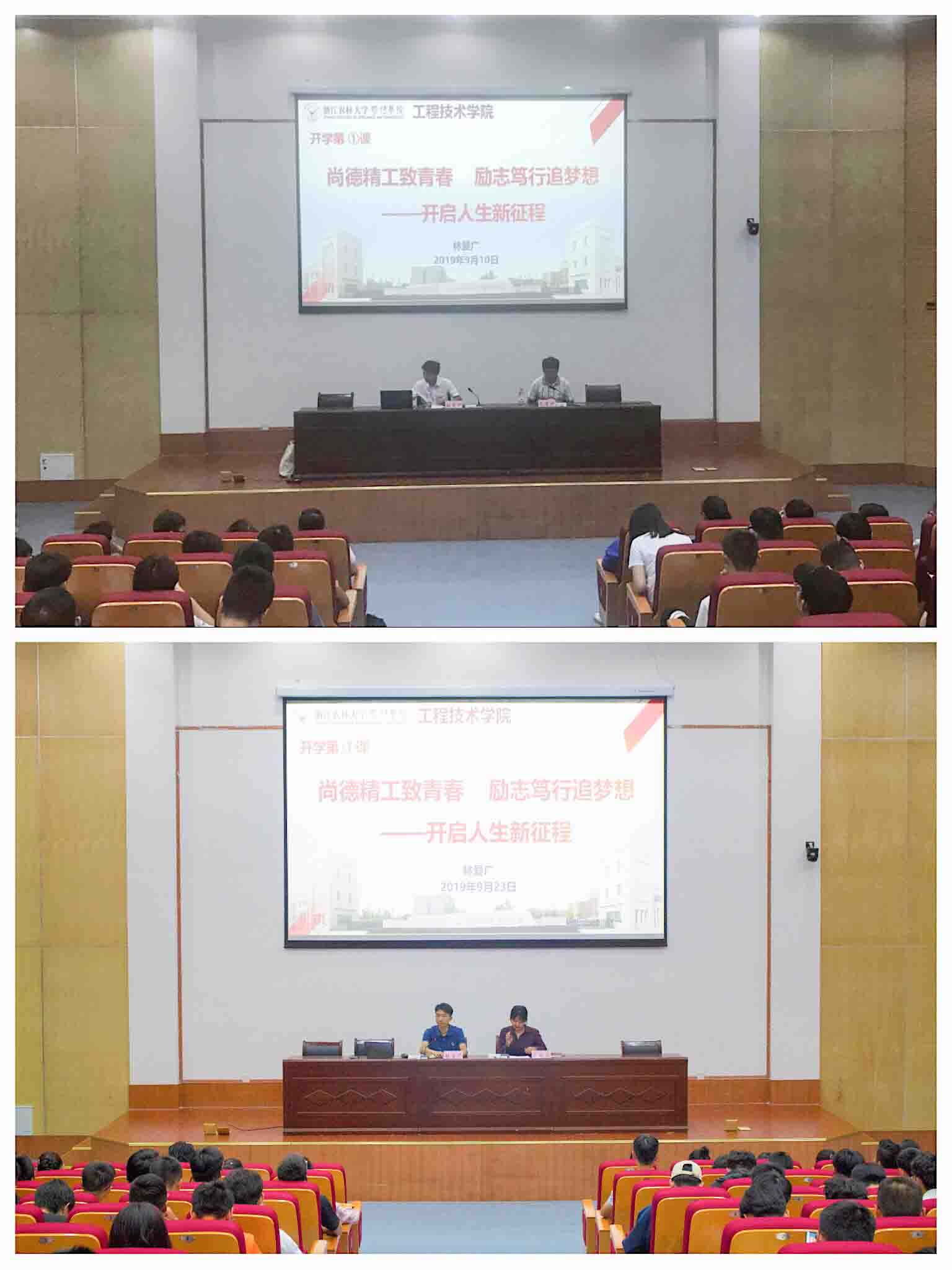 9月12日和9月23日,工程学院党总支书记林爱广在专升本学生入学之际和普通本科生军训结束之时为2019级全体新生讲授大学第一课。