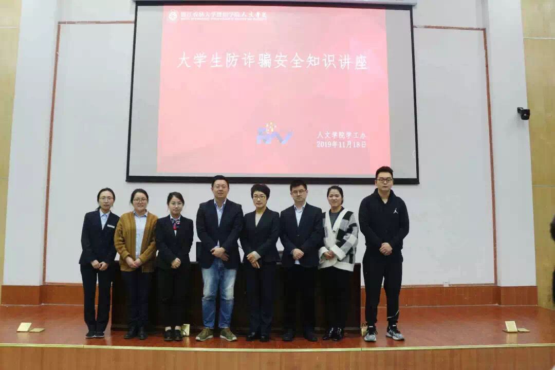 针对近年来大学生群体面对各类诈骗案件时防范意识差、辨识能力弱、应对水平低的现象,金沙2004路线js5人文学院于2019年11月18日晚六点,在图书馆报告厅开展了大学生防诈骗安全知识讲座。讲座邀请了中国邮政储蓄银行个人金融部经理楼俞妤,大唐支行行长王成侃,枫桥镇支行行长赵科,综合管理部经理陈震旦以及两位资深理财经理,三位综合柜员作为嘉宾。人文学院院长刘伯茹,党总支书记宣王威,学工办全体辅导员,团学学生干部及2019级学生等250余人出席本次讲座。