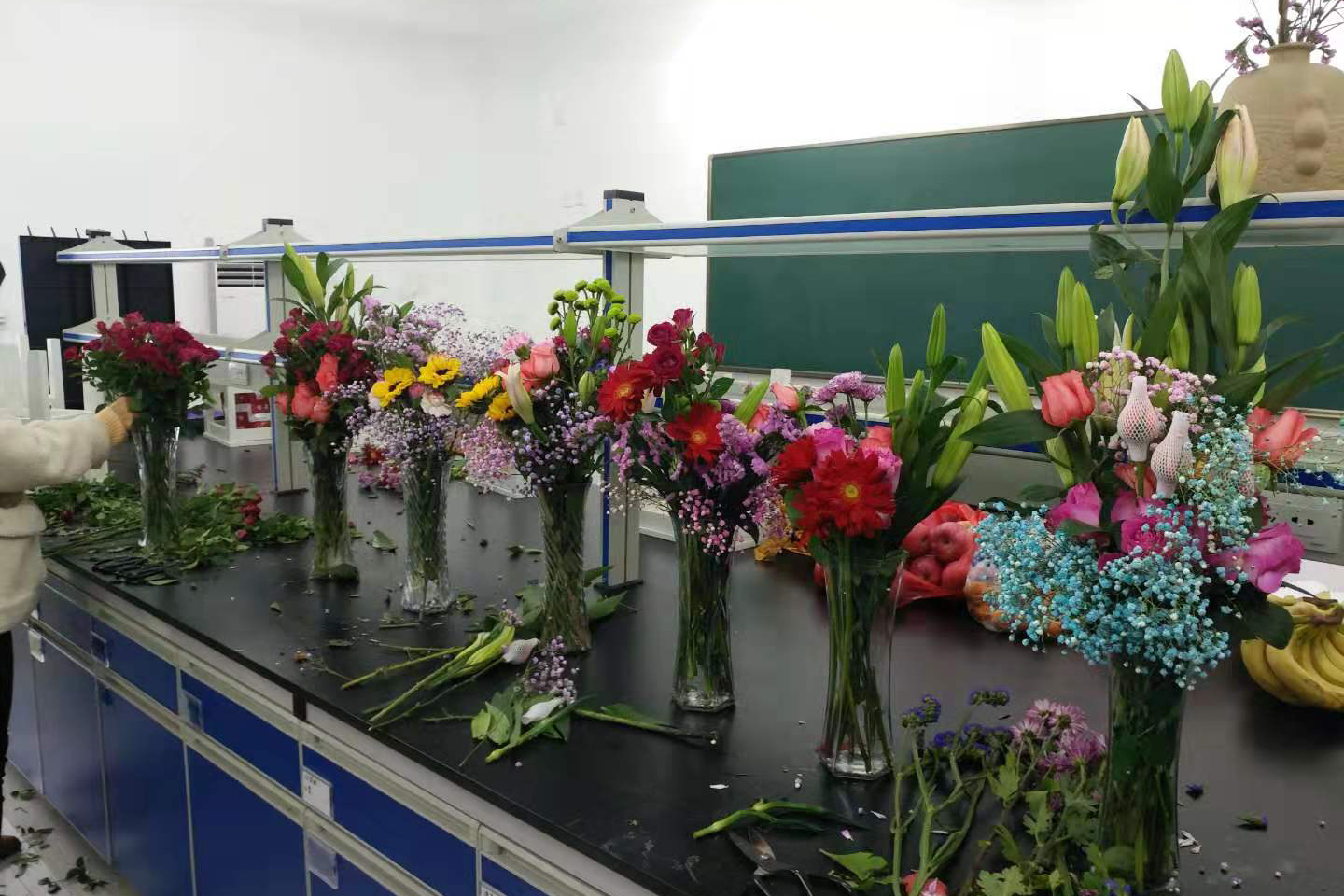 在一个多小时的插花活动中,教职工们凭借每个人对美的不同理解,选择各式各样的花卉,把原本普通的花草,经过修剪、层次搭配、点缀等步骤,变成了色彩斑斓、独具匠心的花艺作品。