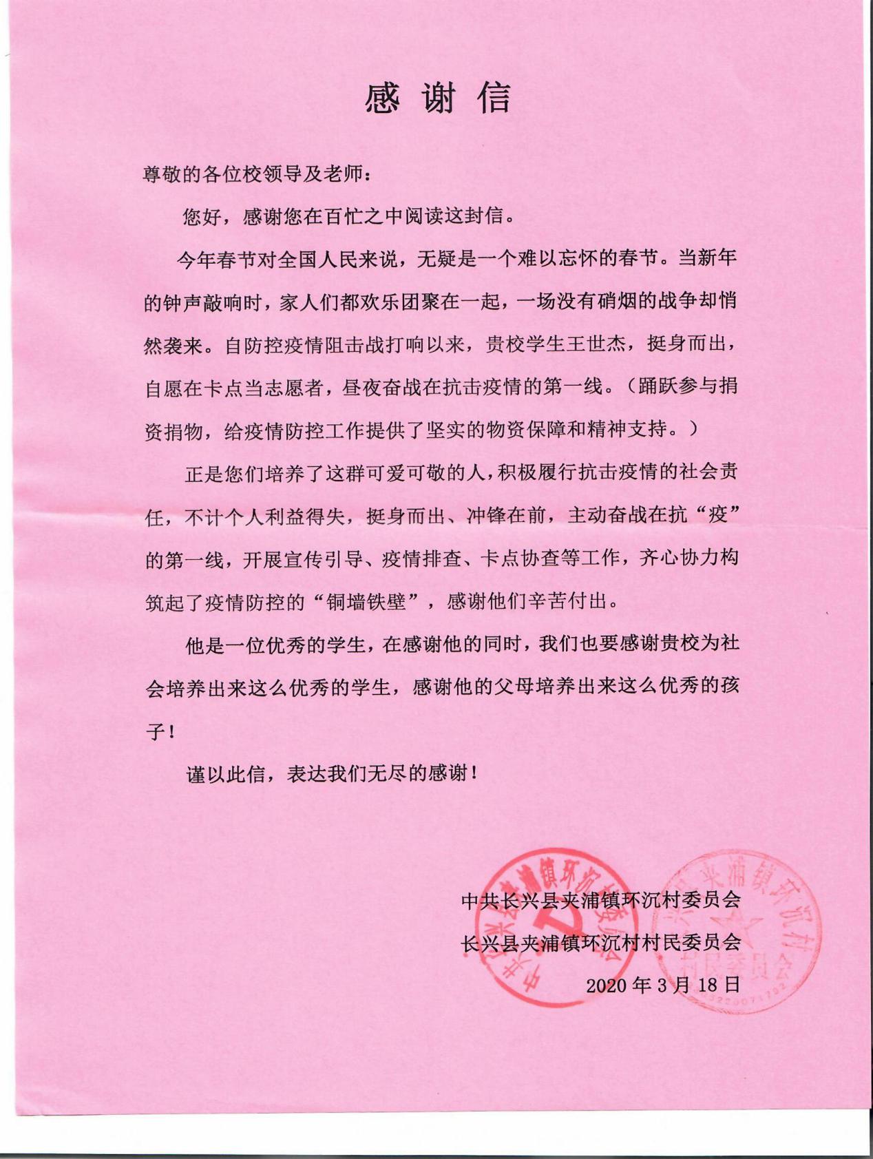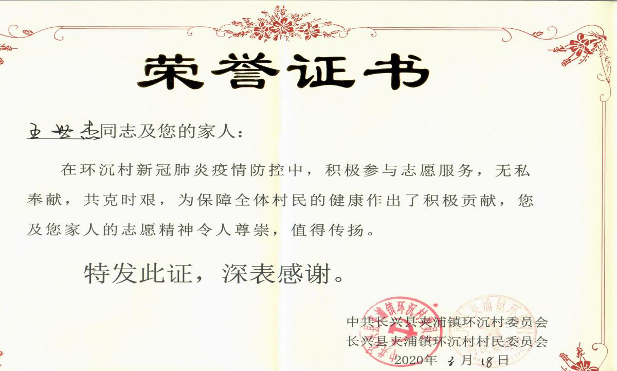 由于王世杰同学在环沉村新冠肺炎疫情防控中,积极参与志愿服务,无私奉献,共克时艰,为保障全体村民的健康作出了积极贡献,湖州市长兴县夹浦镇环沉村村委会向金沙2004路线js5致以谢意并给王世杰同学及其家人颁发了荣誉证书,以表彰王世杰同学在抗疫过程中做出的贡献。