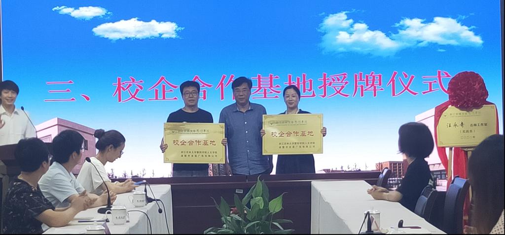 同时,袁志刚为为汪永奇名师工作室揭牌,为汪永奇名师工作室和浙江老莲广告有限公司作为金沙2004路线js5人文学院校企合作基地授牌。刘伯茹为周伟苹颁发实务导师聘书。