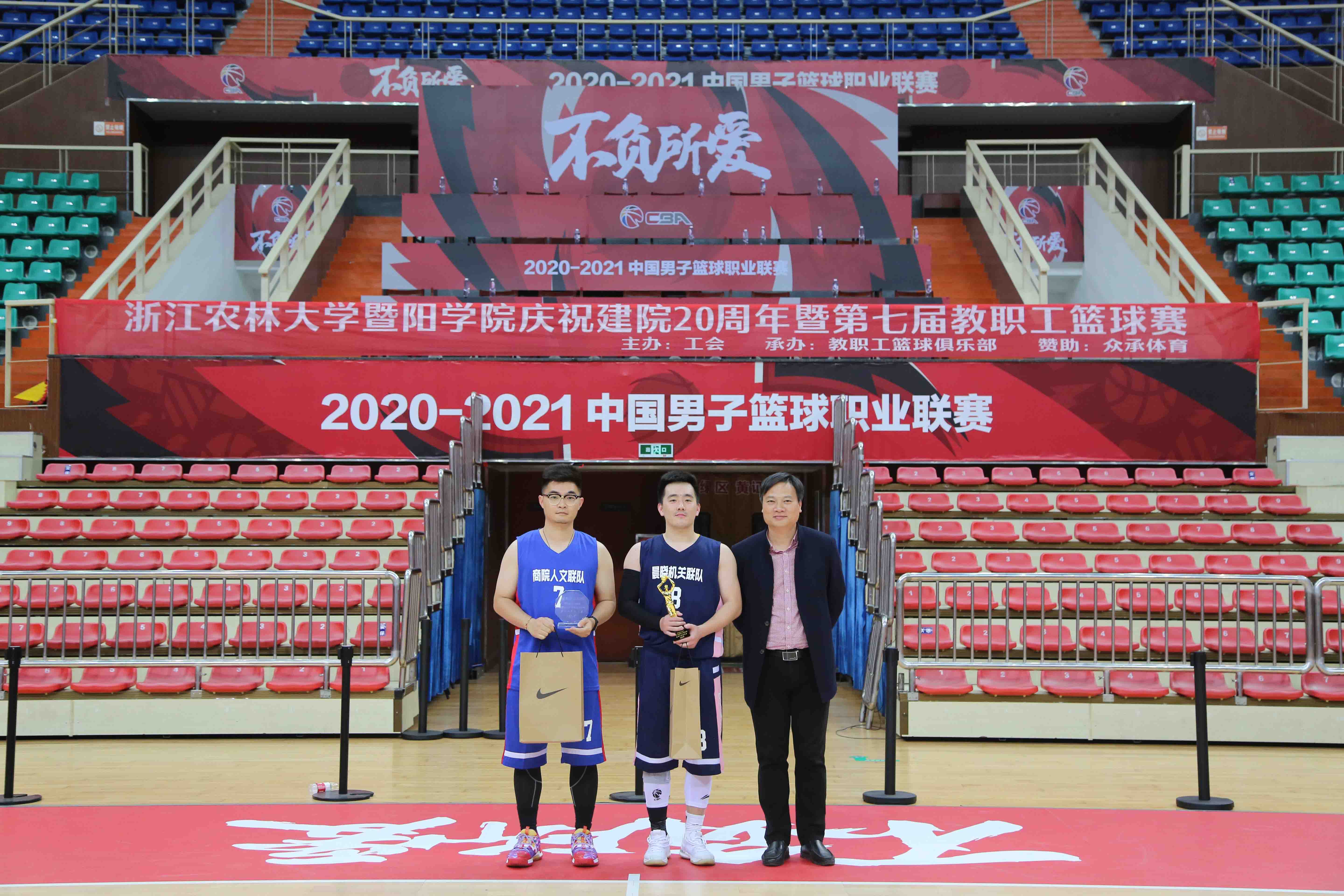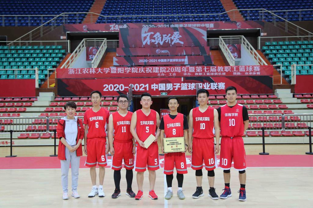 经过激烈角逐,晨晓机关联队摘得桂冠,生环机关联队与商院人文联队分别获得亚军、季军,机关行政队获得顽强拼搏奖,园林工程联队获得精神风貌奖。商学院宣佳亦和体育中心阮凌杰老师分获最佳人气球员奖和最有价值球员奖。徐光辉院长、李文莉副院长、徐平荣主席、教工篮球俱乐部部长何尧军主任、众承体育蔡建霖副总分别为获奖团队和个人颁奖。