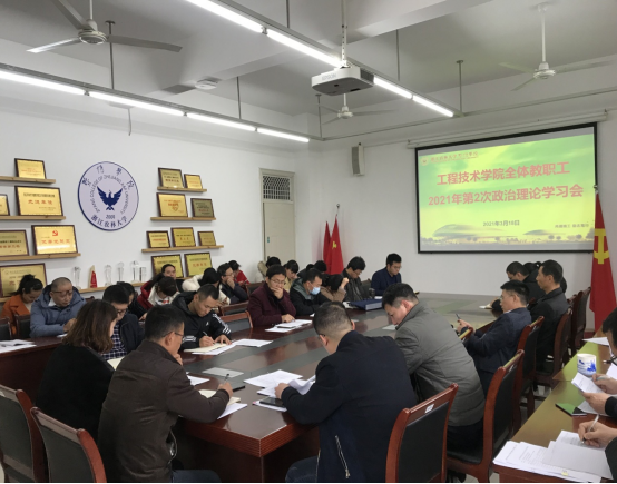 3月18日下午,工程技术学院在理工3402会议室召开2021年第2次全体教职工政治理论学习会,传达学习习近平总书记在党史学习教育动员大会上的重要讲话等会议精神。会议由党总支书记周聪主持,全体教职工参加会议。