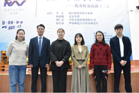 访谈中,三位校友与现场师生共同回忆了昔日美好的校园时光,结合自身的成长过程和社会阅历,分享了他们在大学期间的学业规划以及毕业后的事业发展。郑若添校友号召同学们希望同学们在抓好学习的同时,关注自己的心理健康,通过各方面的学习和生活体悟加强个体品质的塑造;杨淑贻校友则向同学们分享面试经验,鼓励同学们在面试中自信的展示个人特长;李正校友希望同学们在专业课的学习中提升自己的辩证思维,将理论学习更好地运用到实际生活中。就“毕业就等于失业”这句话,校友们一致认为同学们应在在校期间尽早找准目标定位,明确实施计划,在学习实践中不断成长,逐步提高综合能力;抓住机会,主动出击。