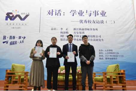 放飞青春梦想,成就出彩人生。4月8日下午,人文学院在图书馆报告厅举行出彩新青年论坛第十五讲,邀请三位优秀毕业生作客论坛,共话学业成长与事业发展。人文学院院长刘伯茹,党总支副书记石杭科,浙江纳森律师事务所、法学063班校友李正,万安集团、公共事业管理161班校友杨淑贻,华东师范大学在读研究生、英语152班校友郑若添,学工办辅导员及学生代表共200余人参加活动。