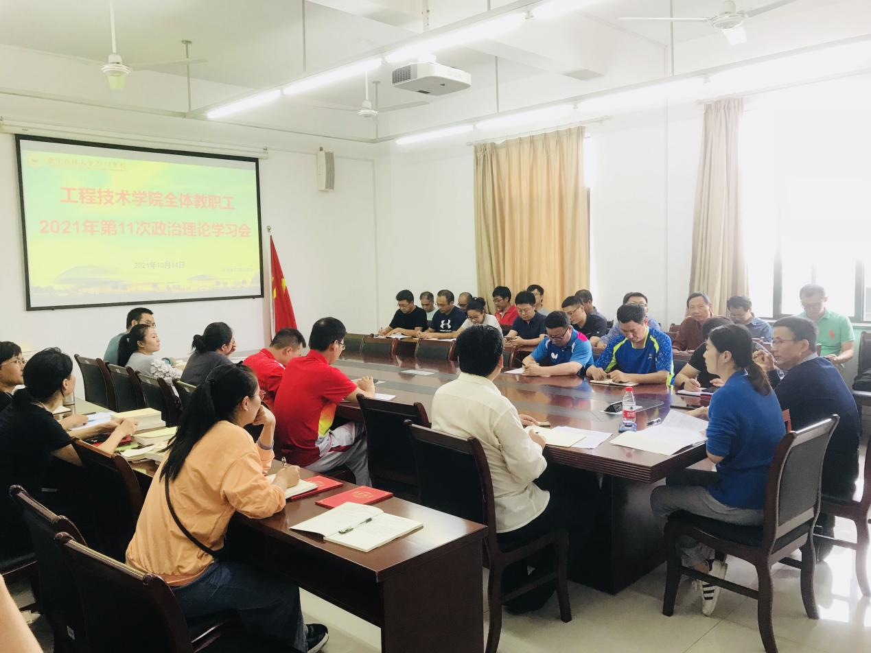 10月14日下午,工程技术学院在理工3402会议室召开2021年度第十一次政治理论学习会,会议由党总支书记周聪主持,全体教职工参加会议。