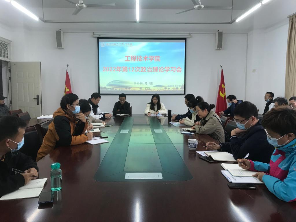 11月17日下午,工程技术学院在理工3402会议室召开了2022年第十二次政治理论学习会,会议由工程学院院长彭樟林主持,工程学院党总支书记周聪、副院长胡建华出席会议,全体教职工参加会议。