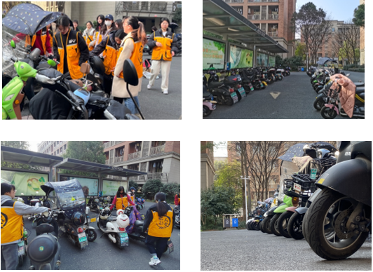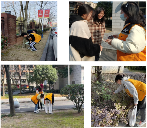 志愿者分为两组,部分志愿者协助整顿电瓶车乱象,提醒同学规范停车,并对不文明停放车辆的同学进行劝阻,另一部分志愿者协助建设美丽绿色暨阳,在商业街、操场、教学楼、绿化带等区域全方位捡拾废物垃圾,并对随地扔垃圾的同学进行劝阻。在志愿服务的过程中,志愿者通过分发书签成功向学校师生传播两会知识,使更多人关注并了解两会。
