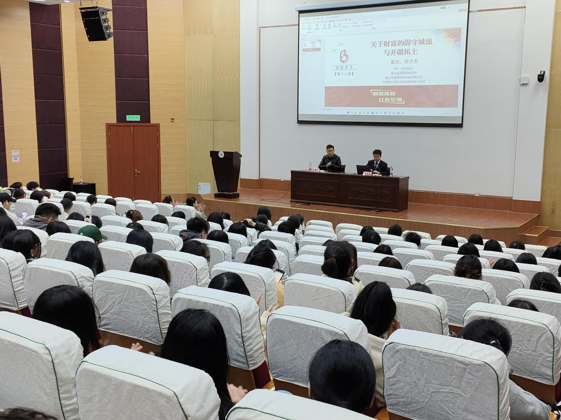 3月27日晚,商学院在图书馆报告厅举办了明德讲堂(第十二讲)《关于财富的固守城池与开疆拓土》。本次讲座邀请中国银行诸暨支行理财经理周子杰作为主讲嘉宾。讲座由商学院党总支副书记屠蒋威主持。商学院党总支书记张佩成、中国银行诸暨支行营业部主任孟柳琼以及商学院近200名师生参加讲座。