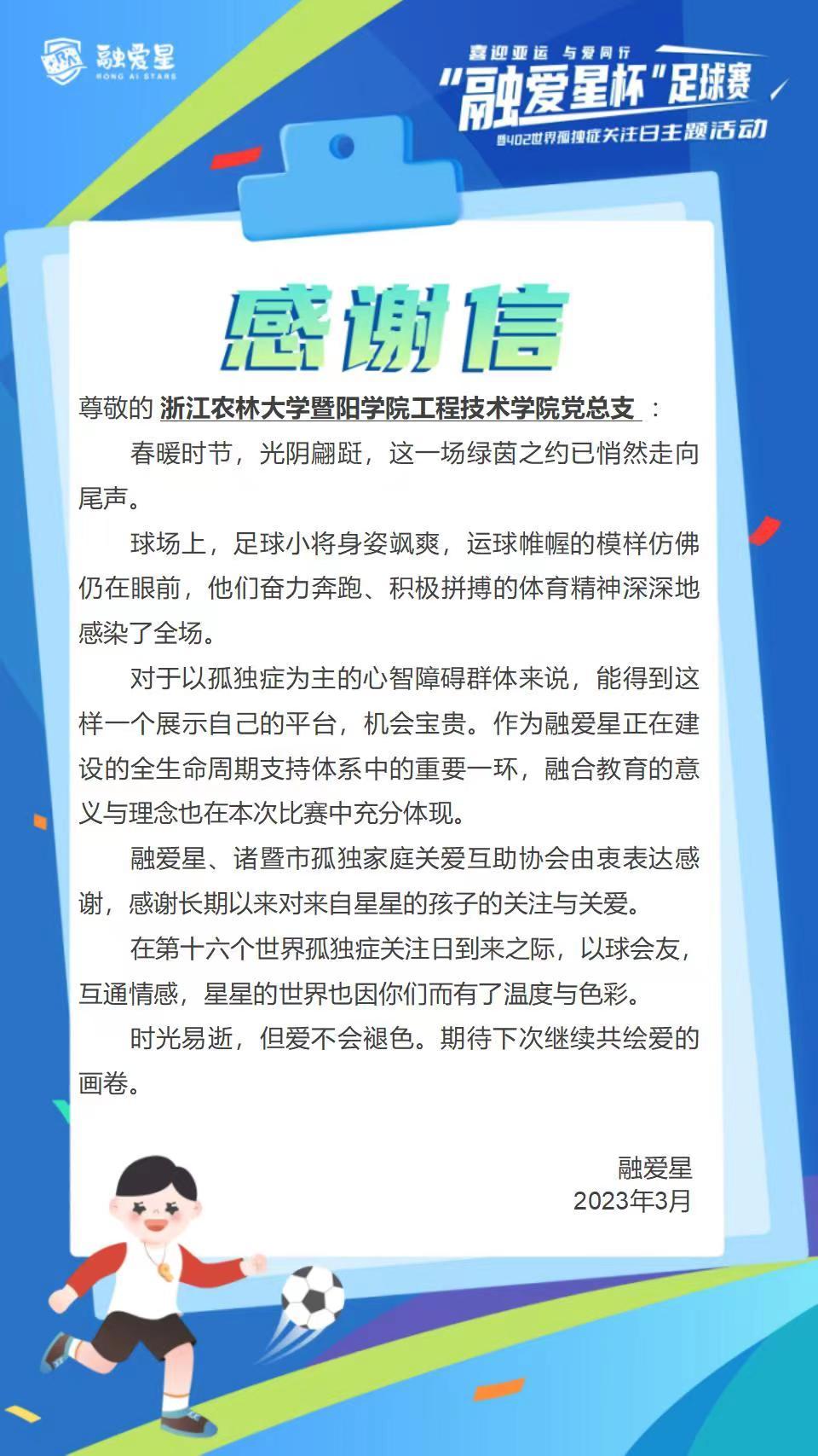 “融爱星、诸暨市孤独家庭关爱互助协会由衷表达感谢长期以来对来自星星的孩子的关注与关爱......”。近日,工程技术学院党总支收到一封来自海亮融爱星教育和诸暨市孤独症家庭关爱协会的感谢信,言真意切的字里行间,流露出对工程技术学院师生党员助力“融爱星杯”足球赛活动的感谢之情。