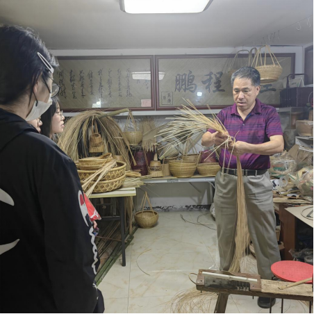 听师傅讲手艺,暗藏守护情感。到达袁建虎师傅的工作室后,正巧遇上袁师傅要进行竹编防腐防虫处理,他便借此机会为实践团成员们上了一堂关于竹编保久的课。课上,袁师傅悉心回答实践团成员们提出的疑惑之处,例如:倘若是用来防止食物的竹编制品,应该采用什么方法来进行防腐放虫处理等等。结束防腐防虫处理课后,袁师傅向实践团成员们讲解竹编这项指尖上的文化最关键的是一幅作品中的每一根篾片或篾丝的宽度。他表示,竹编工艺是他在手指尖沉淀的时光,更是承载着这他对美好生活的记忆!
