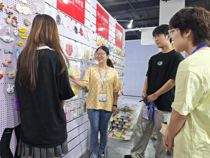 启幕仪式结束后,师生前往诸暨国际商贸城参观博览会主展区,开展企业展台走访调研。师生团队先后走访匠心、亿衡针纺等与袜艺学院合作密切的企业。通过近距离观察和互动交流,参观师生不仅直观了解当前袜业市场的产品创新方向,也对企业生产运营模式有了更真切地感受。