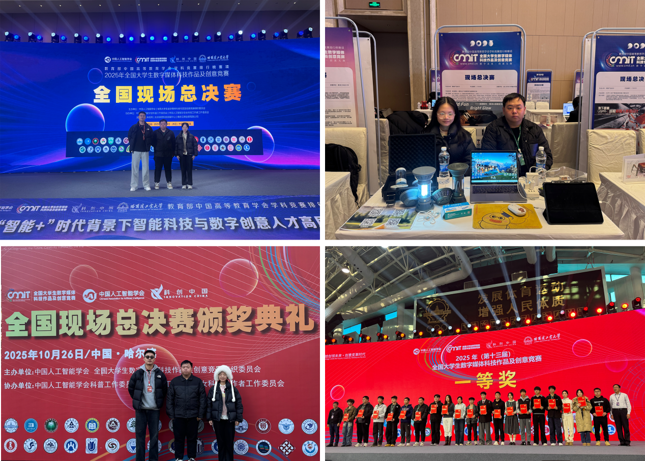 10月24-26日,2025年第十三届全国大学生数字媒体科技作品及创意竞赛决赛在黑龙江省哈尔滨市举行。学院师生首次参赛即表现优异,共斩获国家级奖项1项、省级奖项2项,展现出卓越的创新能力和专业素养。
