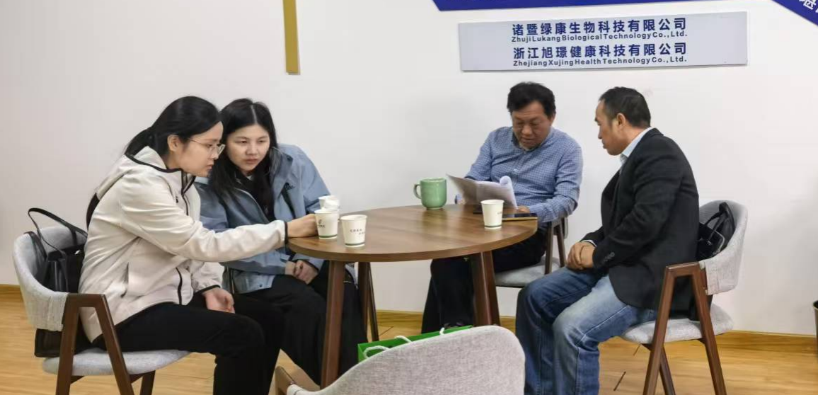 在浙江旭景健康科技有限公司,团队认真聆听了企业关于诸暨特色药材香榧在大健康产品领域的深度开发及市场趋势介绍。同时,双方围绕大健康产业发展趋势下,复合型中药专业人才的培养方向、课程设置如何对接产业需求等展开探讨。