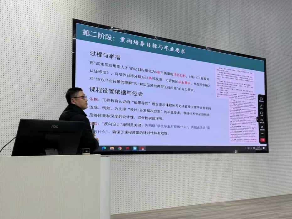 工程技术学院教师俞伟鹏则分享了其在人才培养方案制定的实践经验。他以机械电子工程专业为例,通过系统化重构“机电解耦”的课程体系,增设工业机器人、新能源汽车技术等前沿模块,将地方产业需求深度融入教学全过程。