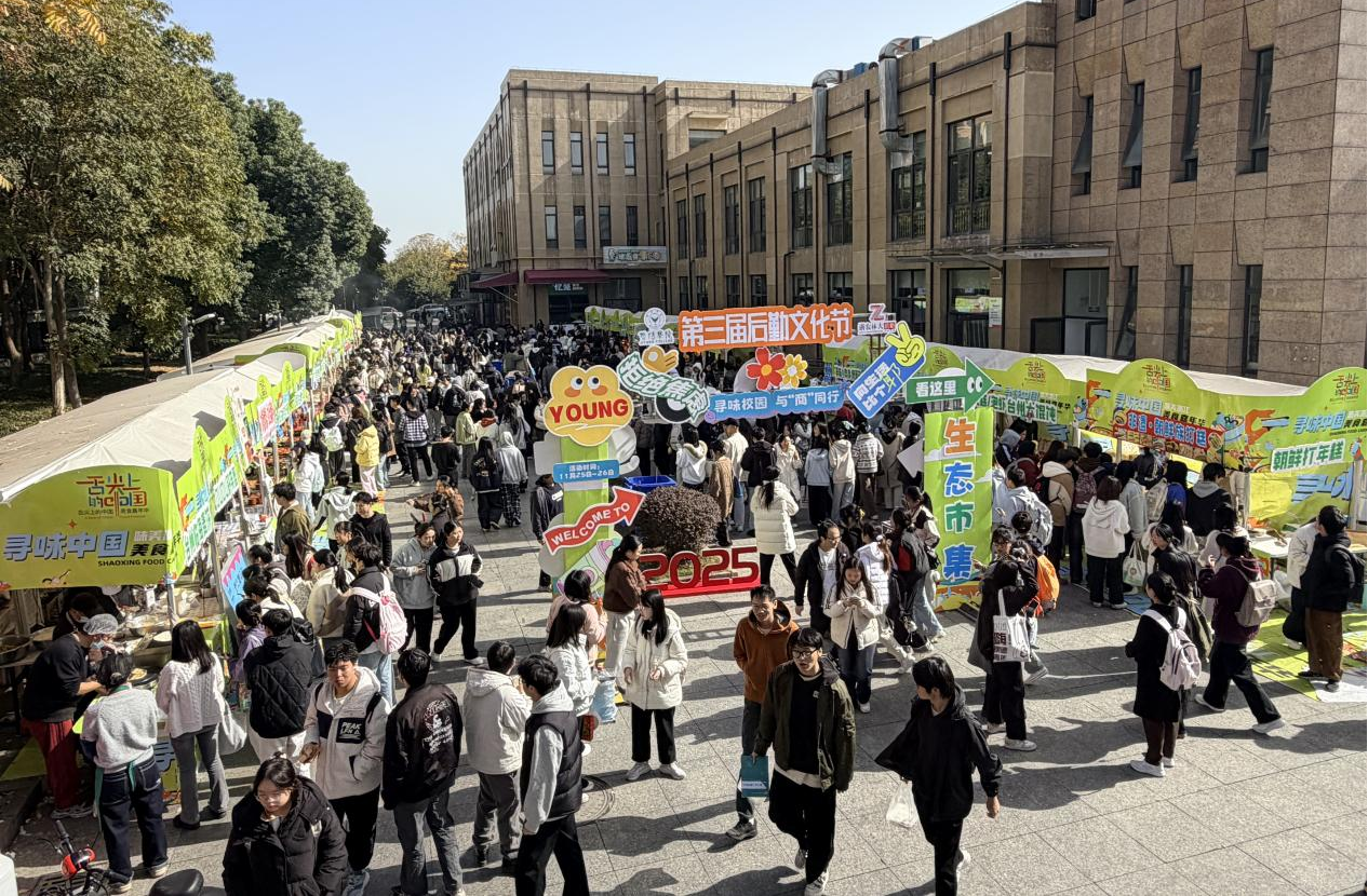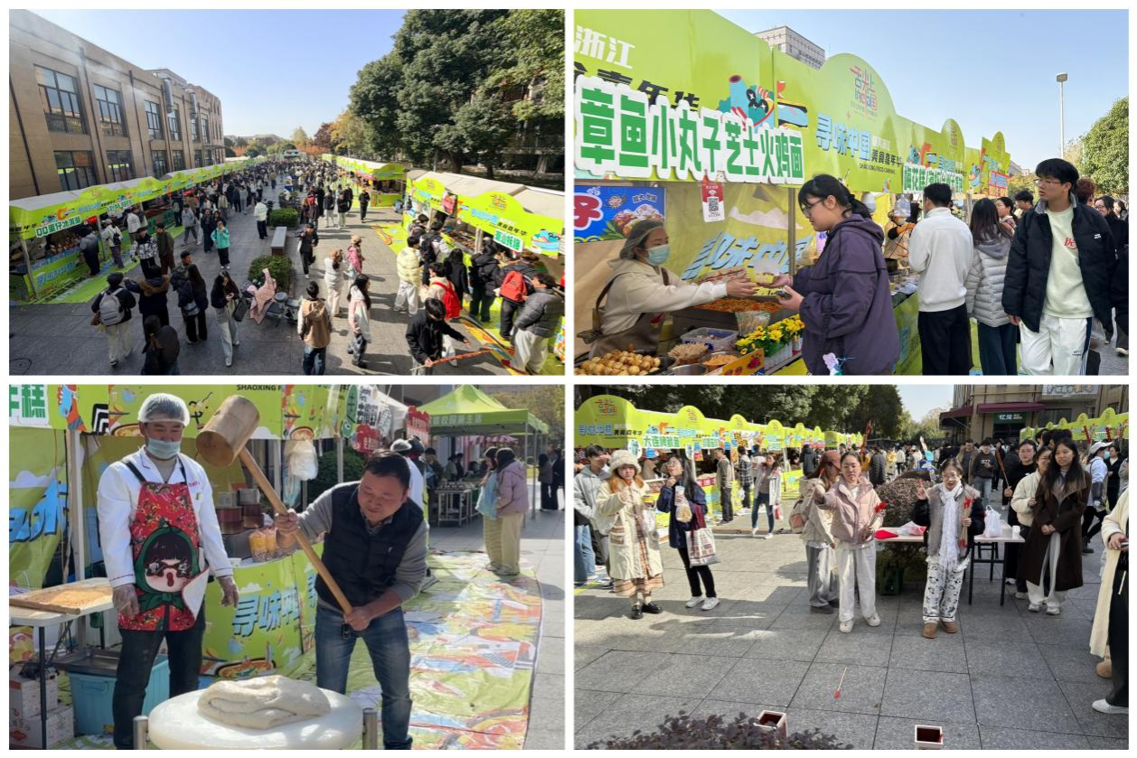 活动伊始,商学院学生带来的暖场节目活力满满,迅速点燃现场气氛。剪彩仪式后,“校园市集”热闹开市,广场瞬间变为烟火气与青春气息交织的互动空间。美食售卖区琳琅满目、香气诱人,既有食堂大厨们匠心打造的招牌硬菜、特色甜品,又汇集了涵盖南北风味的各地特色美食、小吃,从家常滋味到异域风情,一站式满足师生的味蕾期待。打年糕互动体验成为现场亮点,师生们轮番上阵,在木槌“咚咚”的敲击声中体验传统美食的制作乐趣,民俗韵味与互动热情相融,为美食区增添了别样的烟火气息。