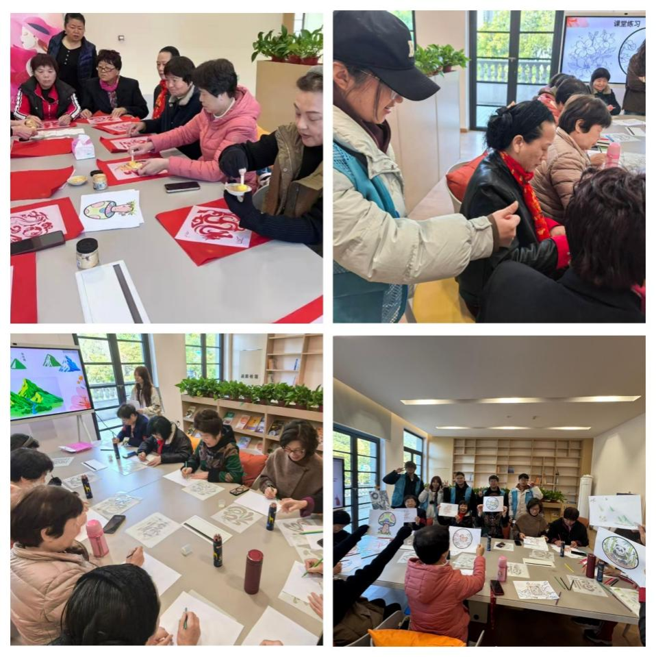 在“非遗拓印”体验环节,志愿者们更是别具匠心。他们提前准备了简易拓版和安全环保的颜料,耐心讲解拓印步骤,并手把手协助老人铺纸、上色、覆压。当一张张清晰的吉祥纹样、传统诗词等图案和文字从拓版上缓缓显现,老人们惊喜不已,纷纷感叹:“这可是老手艺啊”。非遗技艺在指尖流转,文化记忆在互动中被温柔唤醒。