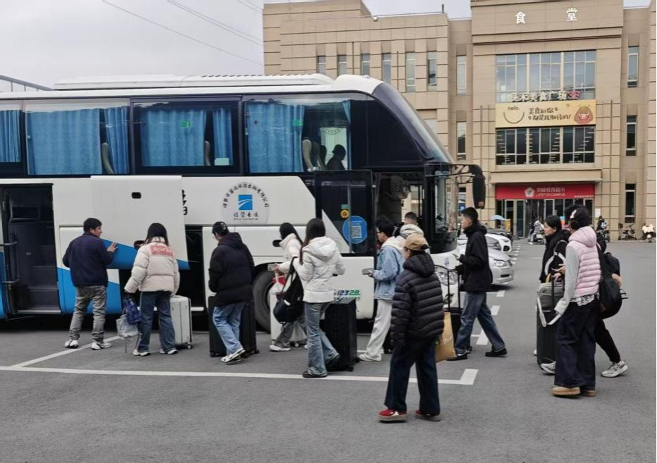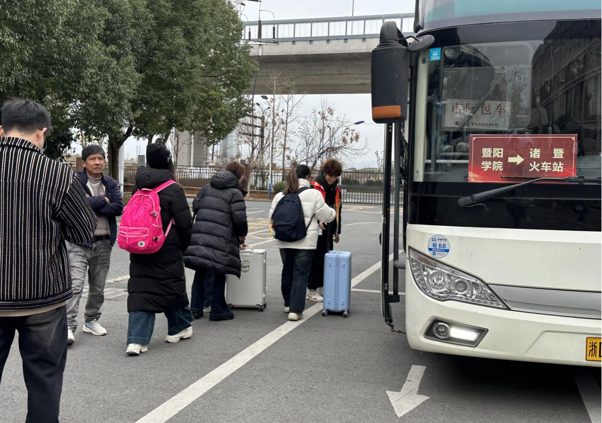 学工部提前联系诸暨长运公司定制两辆大巴车护送返乡学生直达火车站,并安排辅导员老师和学生志愿者全程跟车。中午12点,两辆大巴准时停靠在校园指定乘车点。8名带队教师和11名学生志愿者提早到位,有序引导乘车、协助放置行李。志愿者们分工有序、各司其职,帮助引导大家排队上车、摆放行李,实时在工作群内同步行程信息,并与站点老师、志愿者保持联动。全程配合顺畅,全力保障每一位学子安全抵达车站。