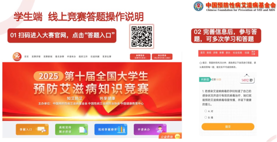 (一)学生通过知识竞赛官网输入学校名称、姓名和学号等信息注册,登录后正式答题参赛。每位学生最多有三次答题机会,每邀请一位同学参与答题则增加一次答题机会,系统将自动选取最高分值作为该学生参与防艾知识竞赛活动的最终成绩。