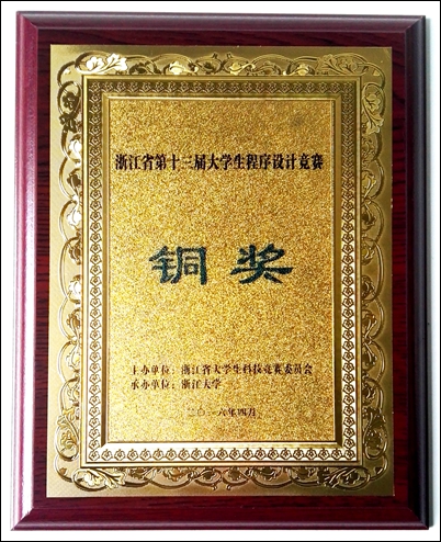 4月23日,浙江省第十三届大学生程序设计大赛在浙江大学计算中心落下帷幕。本届程序设计竞赛共有来自全省76个学校的213支本科队伍参赛,经过5个小时的连续“鏖战”,由金沙官网大学生程序设计竞赛(ACM)教练组(汪杭军、崔坤鹏、楼吉林、李英杰)指导,计算机131班江凯瑞、张智伟、吴佳辰同学组成的“在线的扣一”队伍获得铜牌。
