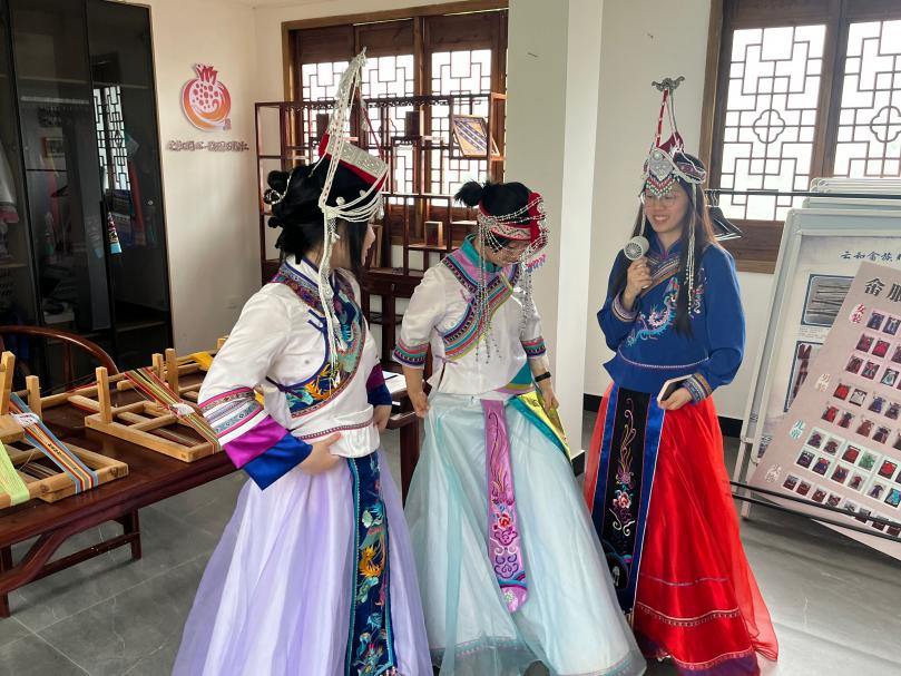 青蓝一脉承古韵,彩带千纹织新篇。团队在畲族民俗展馆系统参观了历史文物,深入了解了畲族传统生活智慧,随后在服饰展馆,团队成员通过试穿精美的凤凰装、佩戴银饰等方式沉浸式体验畲族服饰文化。在体验过程中,畲族服饰独特的蓝黑色基调与彩带纹样寓意引发了团队成员的浓厚兴趣,为此还专程采访了畲族彩带编织技艺非遗传承人蓝文鑫。
