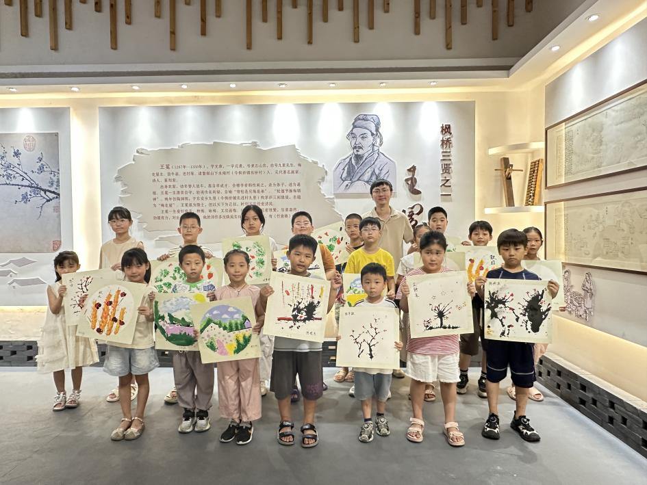 拓印传神现四季,童心跃然绘新趣。“原来王冕不只是画梅高手,他还是发明‘浅绛山水’技法的先驱!”在“王冕的四季”艺术课堂上,孩子们通过视频了解王冕艺术成就后,亲手体验传统拓印技法,将四季美景定格在宣纸上。团队成员表示:“当孩子们用棕刷将四季花卉印在宣纸上时,传统技艺不再是课本中的抽象概念,而是可触摸、可创造的文化体验。这种沉浸式艺术体验,让孩子们在创作中感受传统文化魅力。”