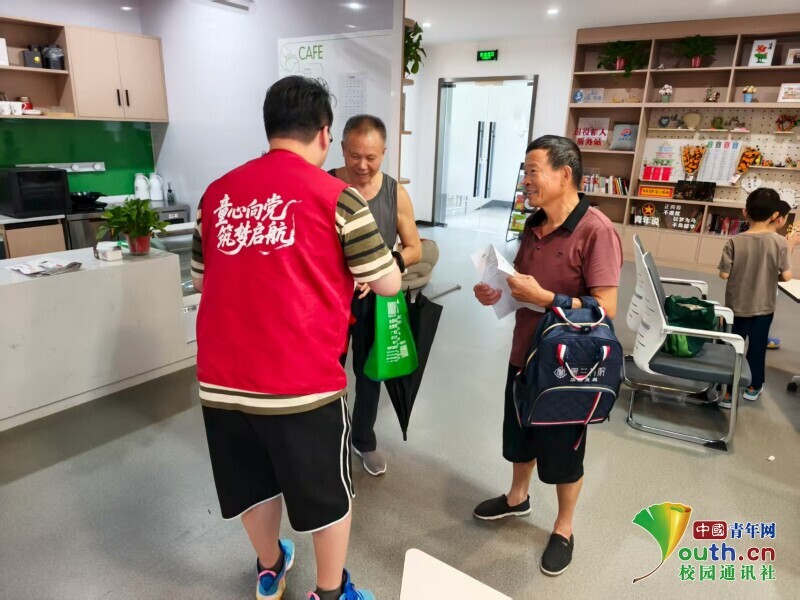 图为实践团成员在永昌社区利用授课闲暇时间为社区的老人送清凉。 李侃远 供图