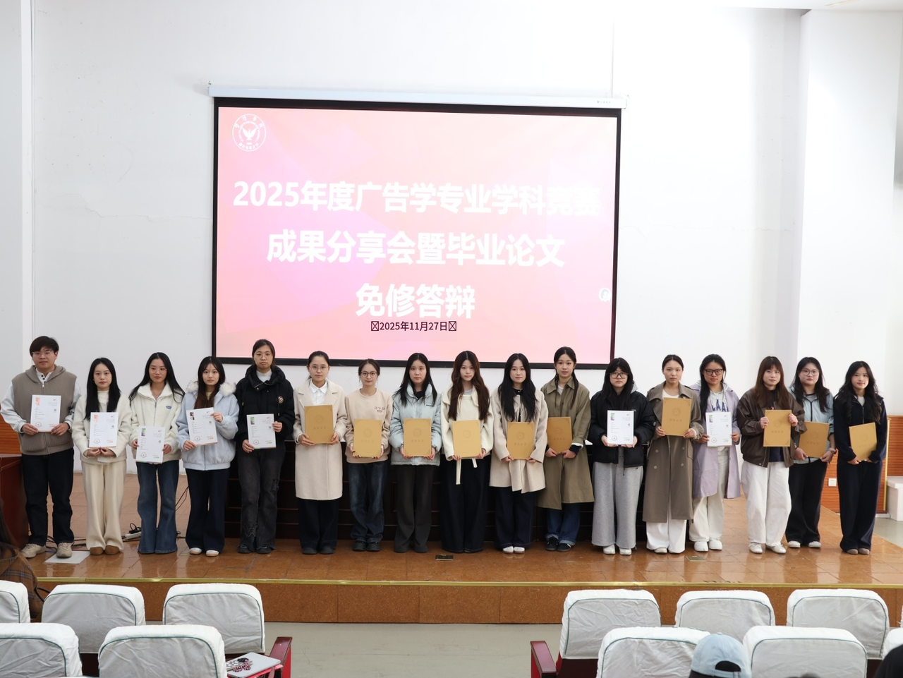 近日,金沙2004路线js52025年度广告学、网络与新媒体专业学科竞赛成果分享会暨毕业论文免修答辩会圆满落幕。17位2026届毕业生因获得省级一等奖及以上奖项,取得毕业论文免修资格,并在现场分享了参赛实战经历与实习成长收获。